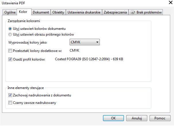 Do druku na offset wysyłaj PDF X/1-a lub X-3 (za każdym razem czcionki jako krzywe) - tak jest najbezpieczniej, bo drukarnia zazwyczaj sama sobie poradzi w takim przypadku (overprint, zalewki, załączone profile itp.). |