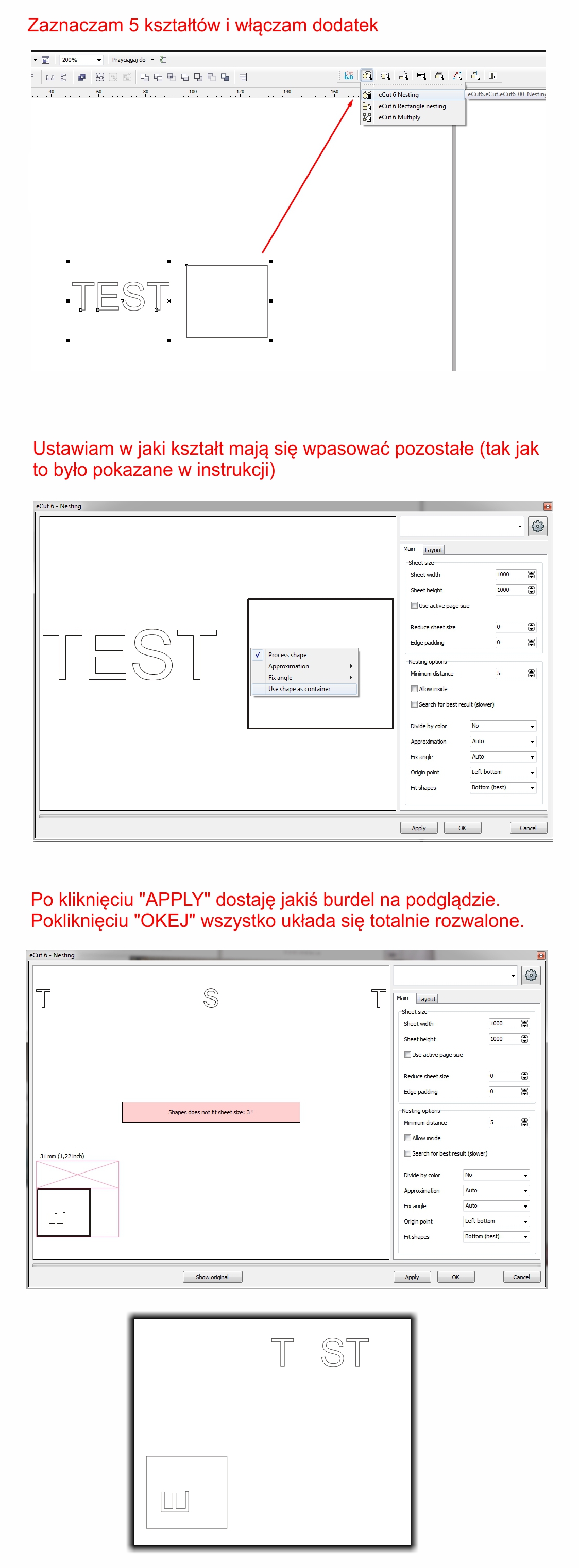 Tyle że ja jak zaznaczę sobie swoje wszystkie elementy i w programie wybiorę element największy by do niego reszta się wpasowała to nic nie dostaję. Nie układa mi się to w podglądzie programu eCut6.